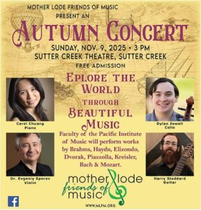 Doors 2:30, show 3 pm. Open seating, beer and wine available. Mother Lode Friends of Music invite you to a “world tour” through beautiful music at their Autumn Concert, Sunday, November 9, 2025, 3:00 pm at the Sutter Creek Theater, Sutter Creek. Faculty of the Pacific Institute of Music, Folsom -- Carol Chuang, Piano; Dr. Evgeniy Sporov, Violin; Dylan Jowell, Cello; Harry Stoddard, Guitar – will perform a lively and culturally varied program of works by Brahms, Haydn, Elizondo, Dvorak,…